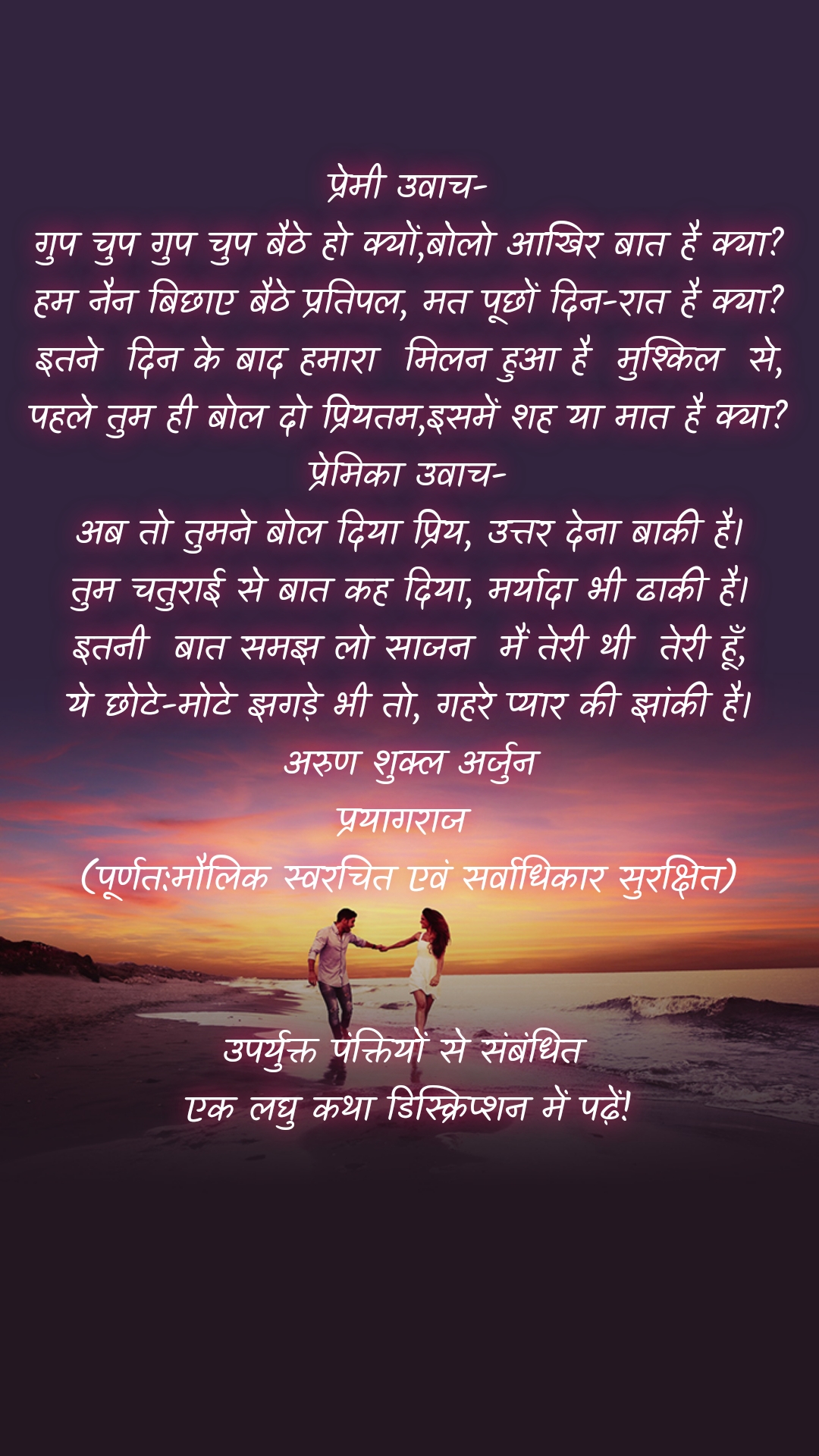ऐसे ही एक छोटे से मधुर नोकझोंक के बाद एक प्रेमी जोड़े ने कुछ दो दिनों तक आपस में बात नहीं की। हालांकि इस दौरान दोनों का मन बहुत ही पीड़ित एवं व्यथित था।दोनों के मन में यह भावना थी कि काश वो बोल देते... या